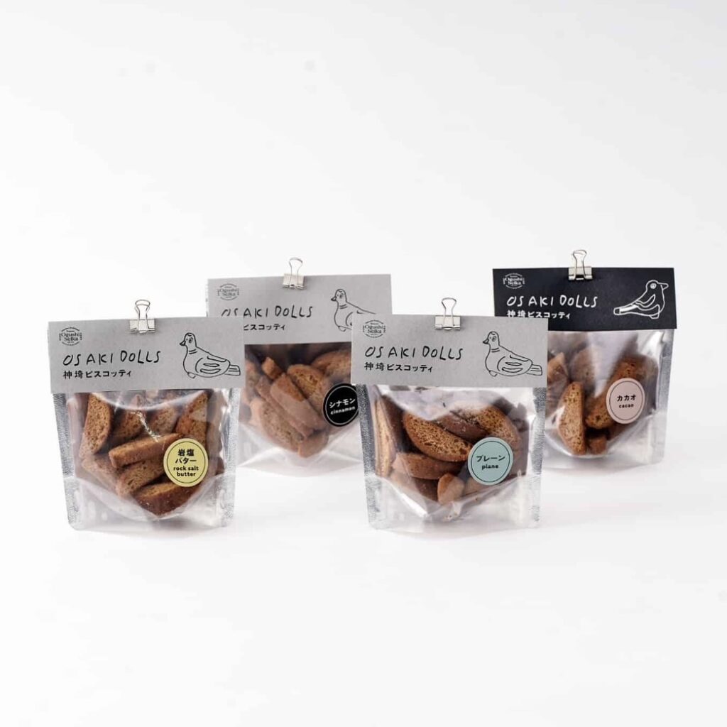 尾崎人形の鳥たちをモチーフにした新食感のリッチなおやつ。元々は作りすぎた丸ボーロにバターを塗って2度焼きしたら、とても美味しかったという秘話から生まれた人気のビスコッティ。定番の「プレーン」 「岩塩バター」「シナモン」に加え、カカオ味の「カチガラス」が登場!